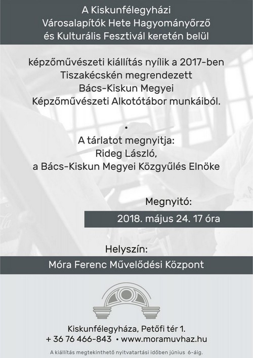 Kiállítás a Bács-Kiskun Megyei Képzőművészeti Alkotótábor munkáiból A kiállítást Rideg László, a Bács-Kiskun Megyei Közgyűlés elnöke nyitja meg. Kiskunfélegyháza, Móra Ferenc Művelődési Központ Május 24